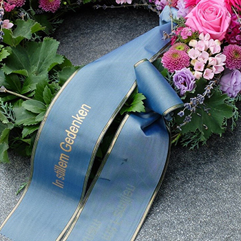 | bedruckte Trauerschleife Indiv. bedruckte Schleife, in versch. Farben, Druckschrift od. Schreibschrift, in gold, schwarz od. grau |