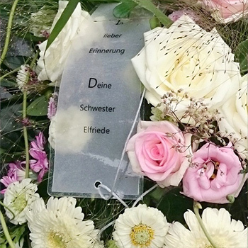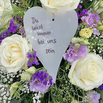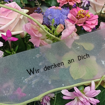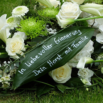 Wählen Sie zu den verschiedenen Buketts eine passende Trauerschleife oder einen Zusatzschmuck mit Beschriftung.